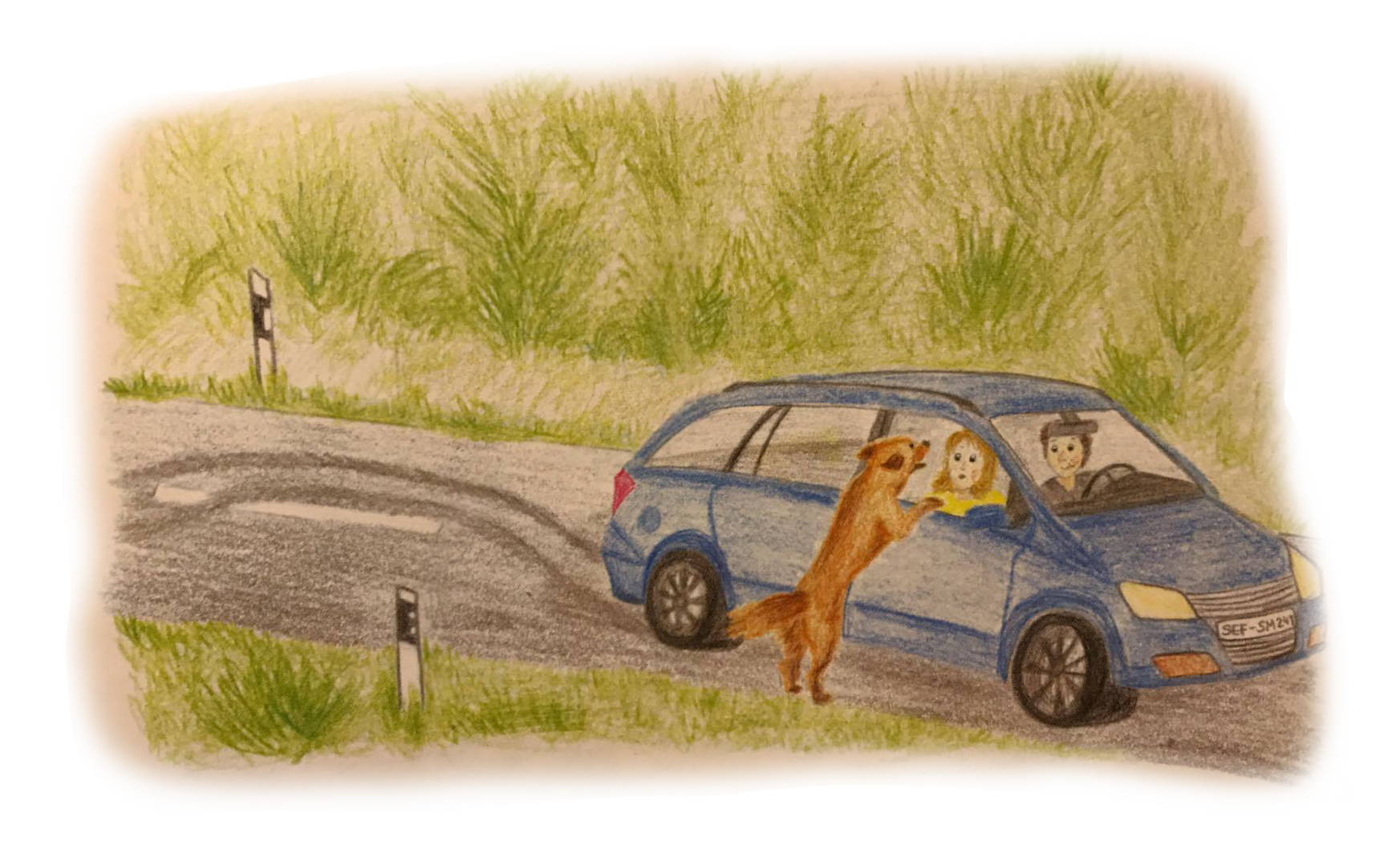 ... "Es hat keinen Zweck", meinte Simon, "so machen wir den Hund nur noch toller." Er hielt das Fahrzeug an. Von diesem fürchterlichen Kläffen war jetzt nichts mehr zu hören. Der Hund stellte sich auf die Hinterbeine und kratzte an der Scheibe der Beifahrertür. Er winselte und jaulte, als wollte er sagen: "Steigt doch endlich aus!" ...
