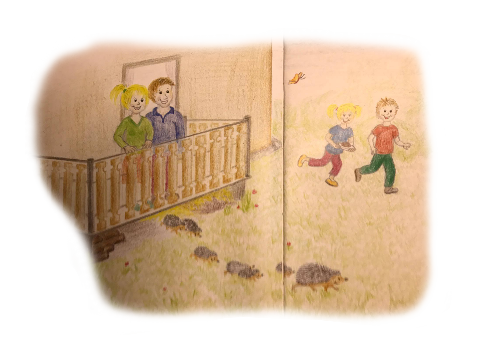 ... Eines Abends, die Sonne war schon verschwunden, sahen die Kids, wie sechs kleine Igel hinter ihrer Mama zum Fressplatz liefen und sich um den Teller verteilten. Nicht einmal das herzhafte Lachen der Kinder konnte sie vom Fressen abhalten. ...